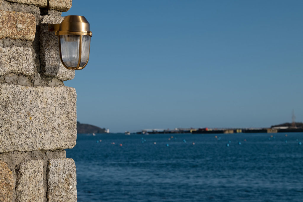 The Flaxman is a sturdy, strong, yet stunning outdoor nautical style bulkhead wall light. The brass outer surrounds an etched glass cover, protecting the bulb, whilst showing the glow.