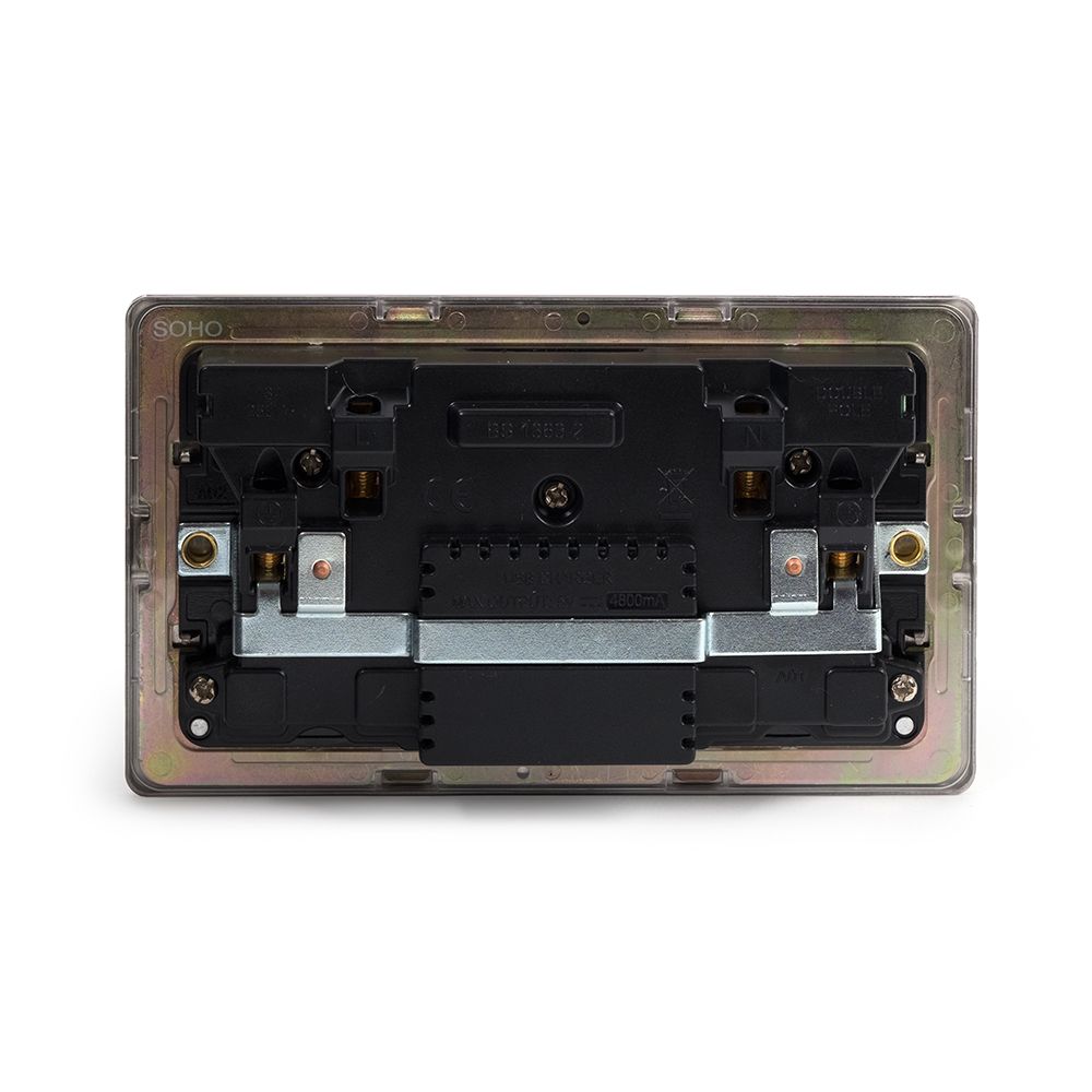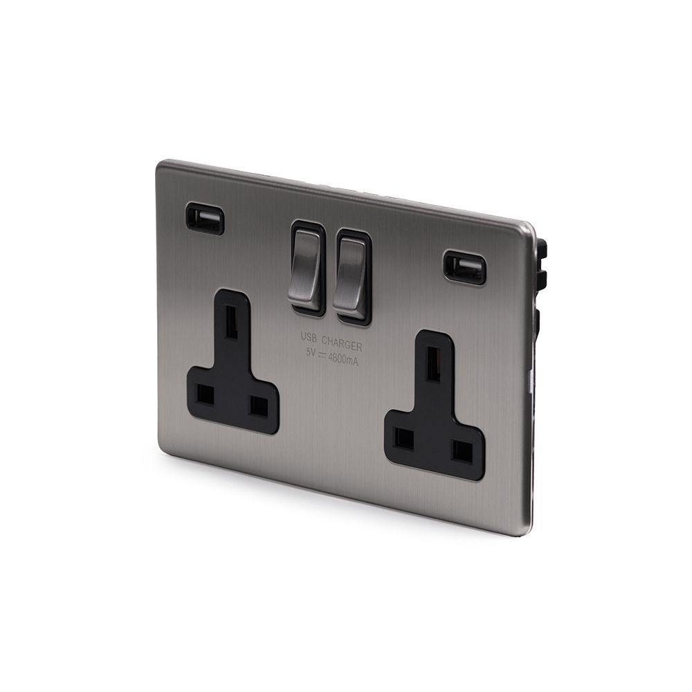 This Satin Steel/Brushed Chrome 2 Gang fast charge double USB Socket (USB Output 4.8amp) with Black Insert has a distinctive appearance and the stylish screwless finish provides a warmer tone than polished chrome and has the added benefit of hiding fingerprints and small blemishes. The smooth, rounded edges and subtle lustre and sheen finish give this collection an understated style which makes it compatible with most interiors making it a very popular choice.