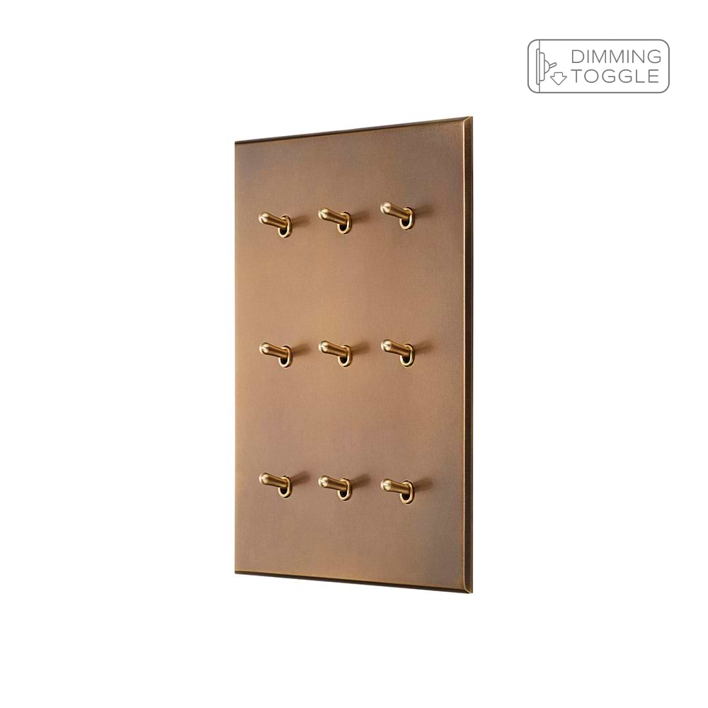 This 9 Gang 2 Way Dimming Toggle Switch, finished in luxurious Aged Brass embodies the history and craftsmanship of the palaces. Treated to evoke a timeworn appearance, it will add character and depth to your interior.