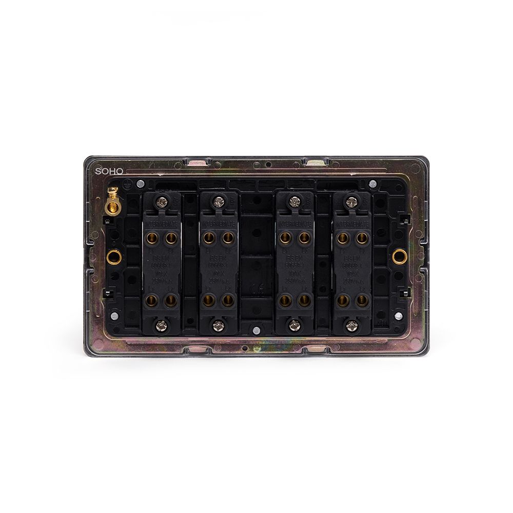 This Antique Brass 10A 4 Gang Intermediate Switch with Black Insert is plated, brushed and aged to create the warmest of our finishes and a perfect complement for many period styles.