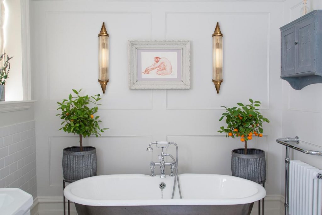 Cast a soft glow on your favorite artworks or frame them by positioning wall lights on either side. Wall lights, especially when placed around mirrors, provide focused illumination ideal for tasks like shaving, applying makeup, or styling your hair. Opt for a wall light with an adjustable shade that can be positioned to cast light in any desired direction. This helps reduce shadows and ensures you have the right amount of light where you need it most. Properly positioned wall lights can also help reduce glare, making the bathroom more comfortable to use. This is particularly beneficial for those with sensitive eyes or for creating a relaxing environment.