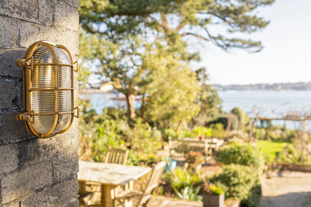 The Flaxman is a sturdy, strong, yet stunning outdoor nautical style bulkhead wall light. The brass outer surrounds an etched glass cover, protecting the bulb, whilst showing the glow.