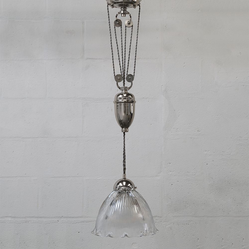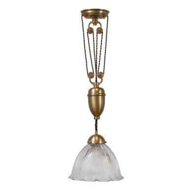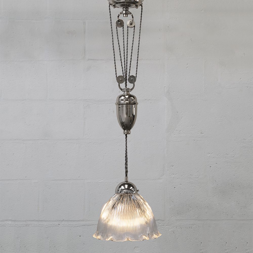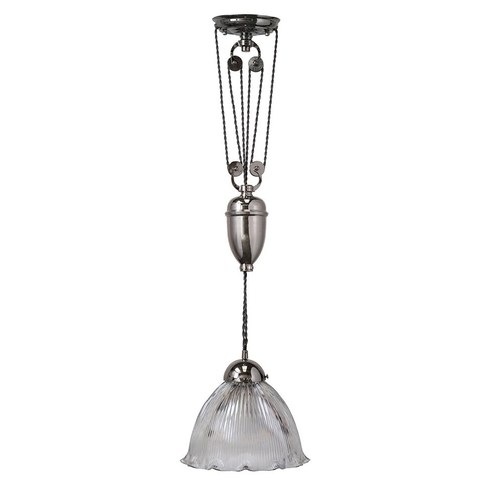 The D'Arblay rise and fall pendant is a classically inspired design influenced by the bistros of the early 1900's Provincial France. With a sophisticated modern twist, this timeless pendant features a pulley system and counterweight to allow for the height to be instantaneously adjusted through the decorative braided flex. The petite holophane style scalloped glass dome shade is designed to deliver optimum light output and eliminate shadows and glare.