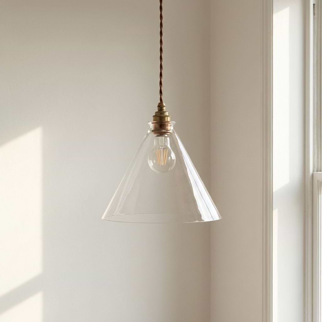 The tall conical shape of the Thomas clear glass pendant light exudes effortless sophistication, pleasantly illuminating any classically styled space, a real twist on the classic shade pendant.