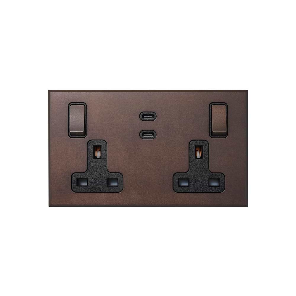 This 2 Gang 13A Switched Socket 65W Max PD C+C USB Charging with Black Insert , finished in luxurious Heritage Bronze is a solid brass plate expertly treated to evoke the rich patina of aged bronze, giving the hardware a rich, opulent tone. Echoing the historical provenance of the palaces’ original switches, it conveys a depth and elegance in keeping with the traditional archetypes.