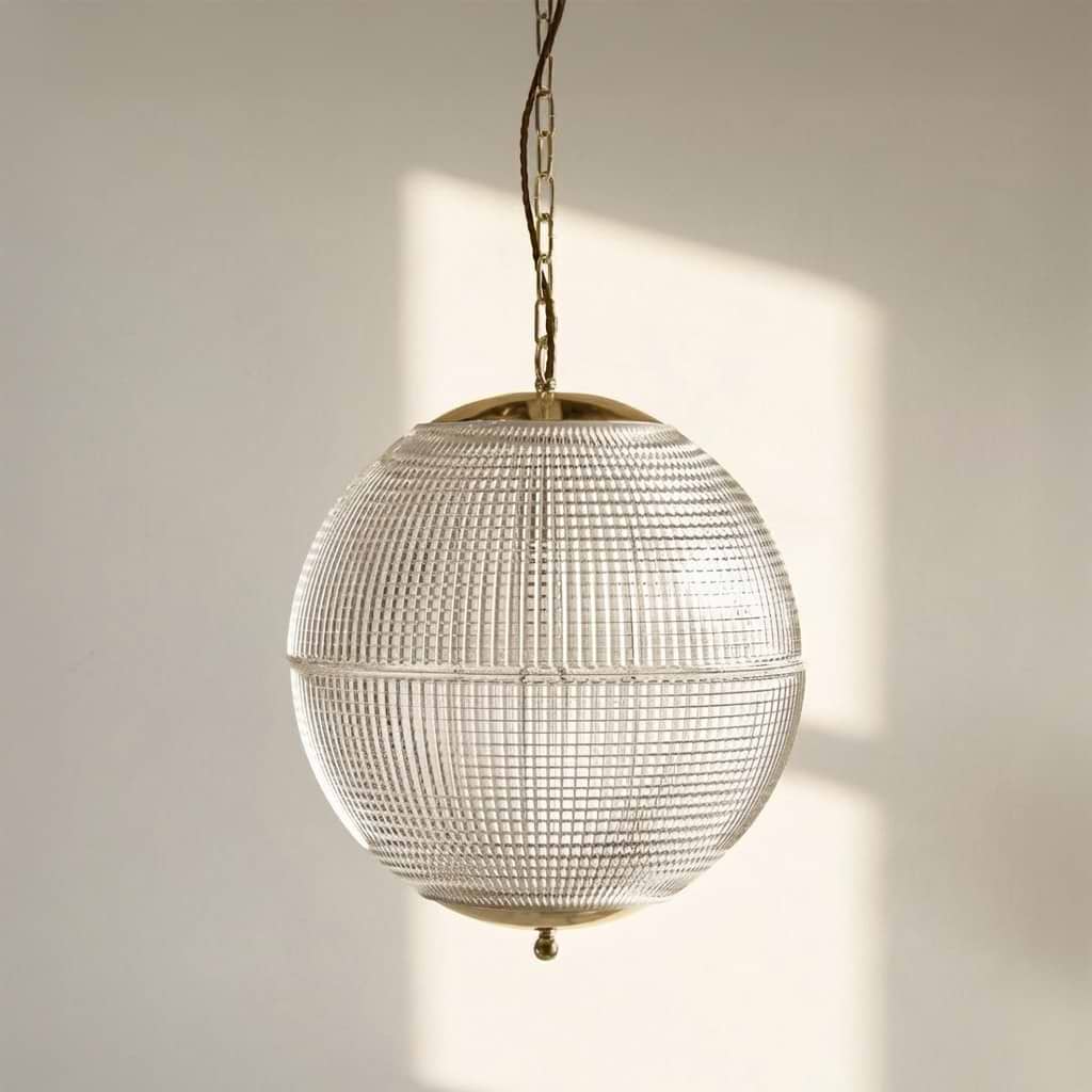 Inspired by the 1950s Paris Holophane Globe Street Light, this iconic prismatic sphere design once lit the thoroughfares of the French Capital. Transformed from the practical to the sophisticated and stylish, the textured prismatic glass of this classic Hollen Globe is designed with a simple unlacquered brass cap and ball finished base to provide a wonderful, ambient light without casting shadow or glare. Resplendent in both period and contemporary settings this stunning pendant effortlessly connects the old with the new.