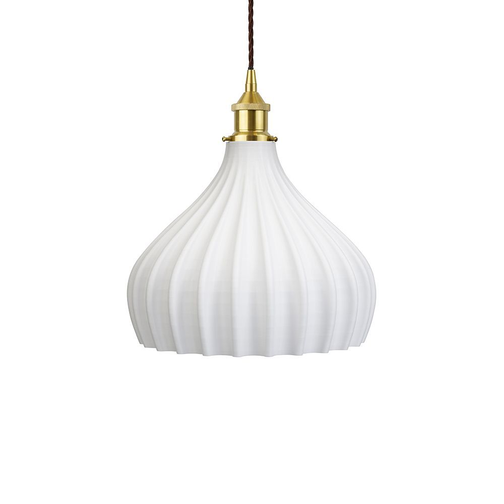 This delicate, softly sculptured, shell-like pendant casts out a wash of downwards light. Stunning hung as a singular pendant or in multiples over a dining table or kitchen island, this beautiful aesthetic is working to rid our oceans of plastic.