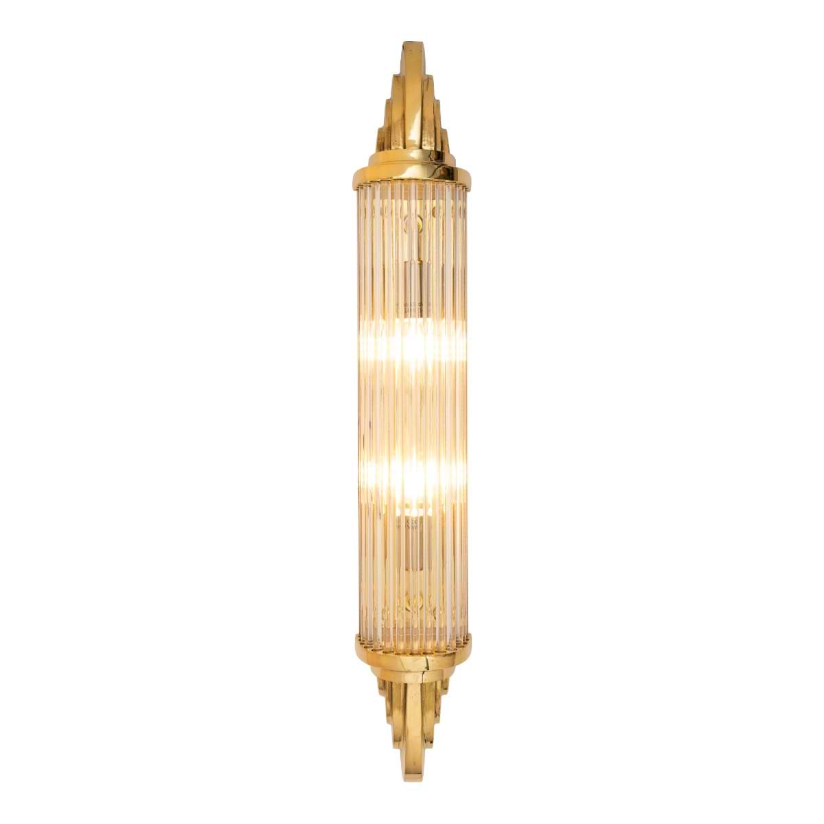 The sleek lines of our stunning Sheraton brass pillar wall light will add style and sophistication to any interior. The art deco scallop shell detailing is hand finished in solid brass and the beautiful prismatic glass casts out pure, uninhibited light to perfectly illuminate the space around. These exquisite lights are especially effective at lighting mirrors.
