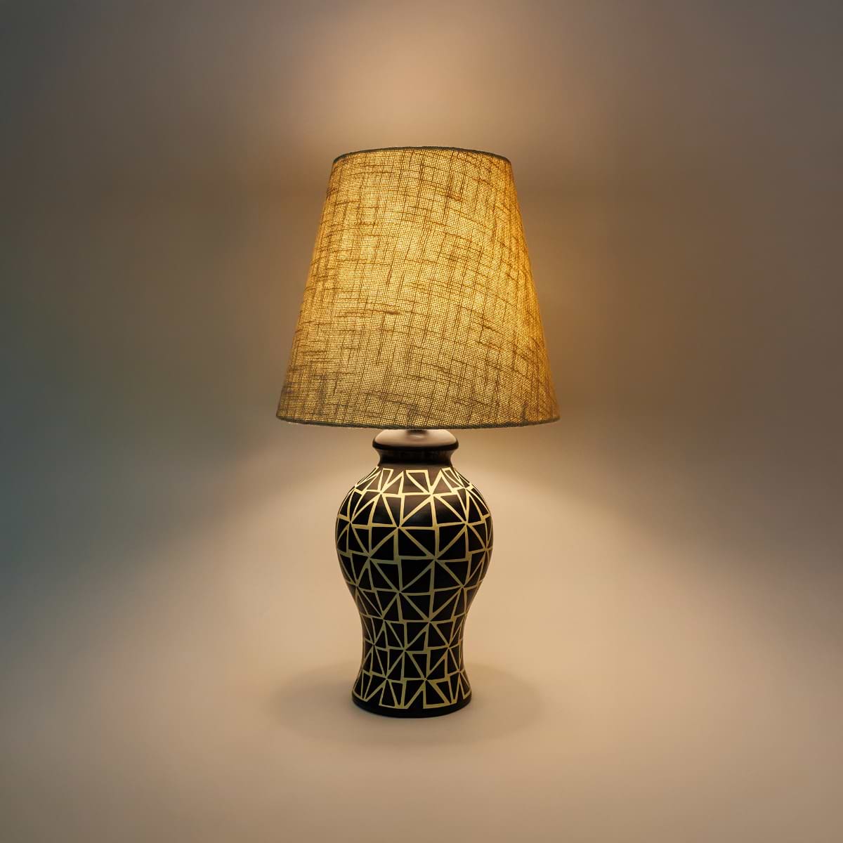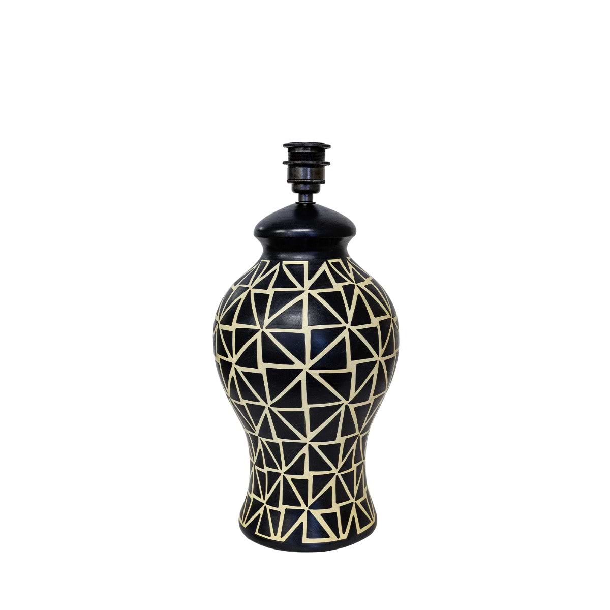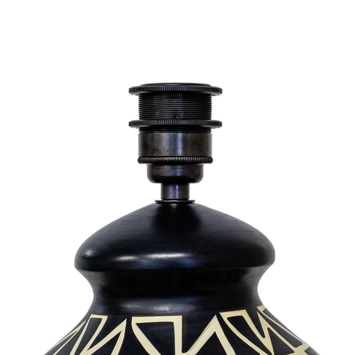 We have teamed up with renowned landscape architect Randle Siddeley to create a collection of table lamps inspired by his travels to Nicaragua. Hand-made from volcanic clay by Nicaraguan artisans, each lamp is hand-painted with idiosyncratic shapes and geometric patterns in a monochromatic palette for a true statement piece. Includes an empire shade crafted in off-white bouclé for a soft, textured finish.