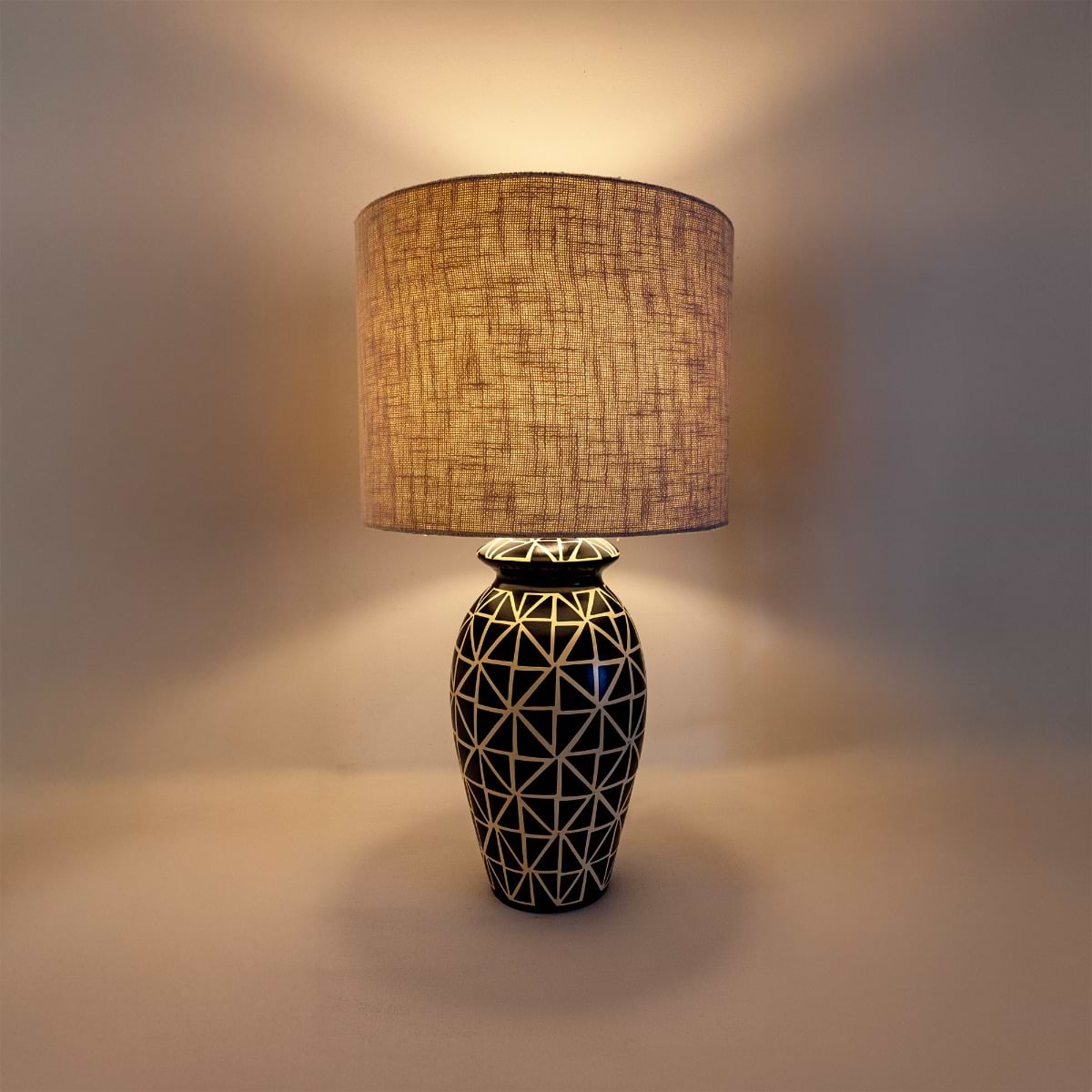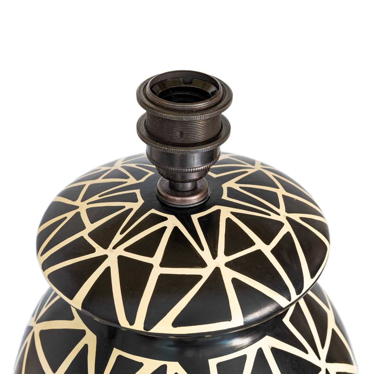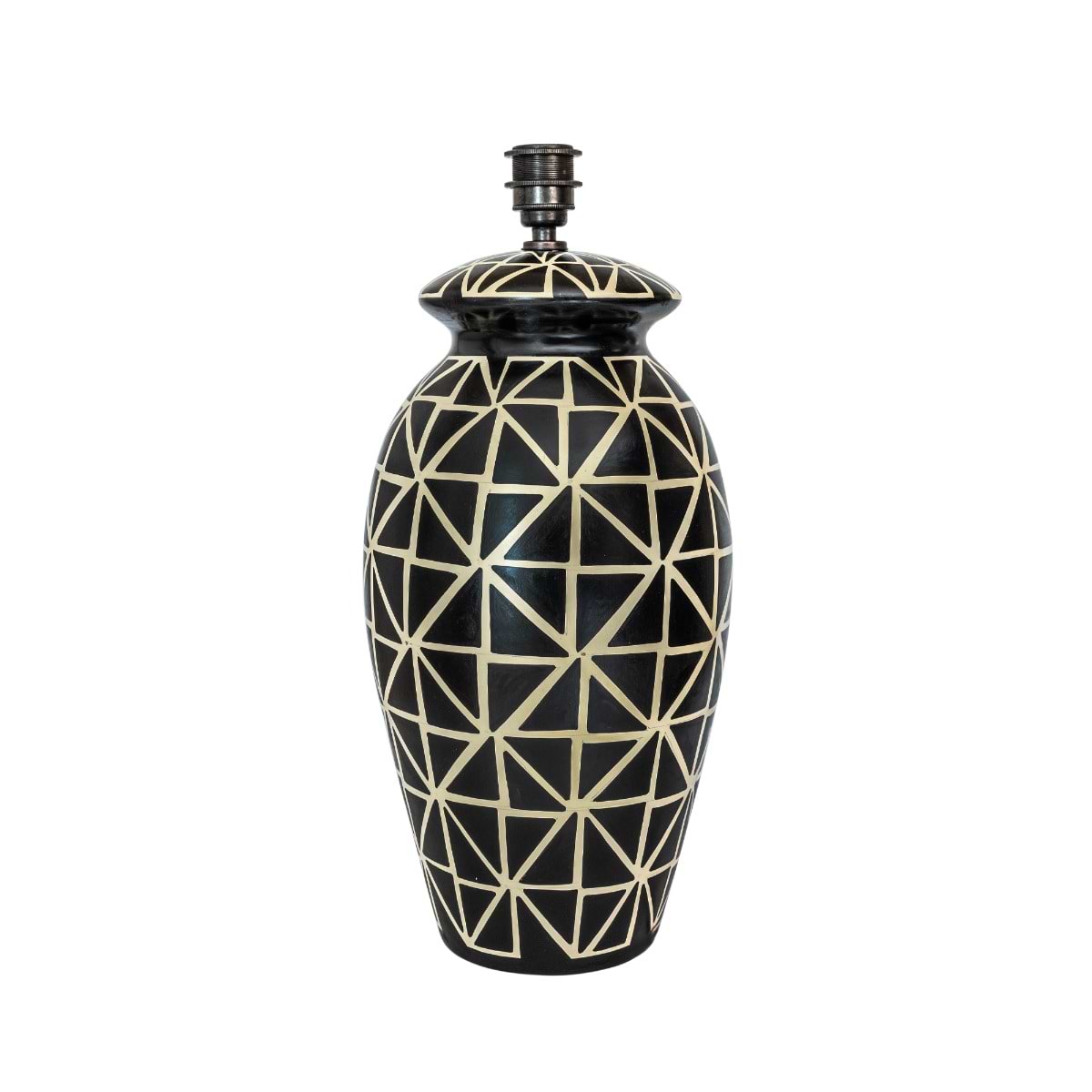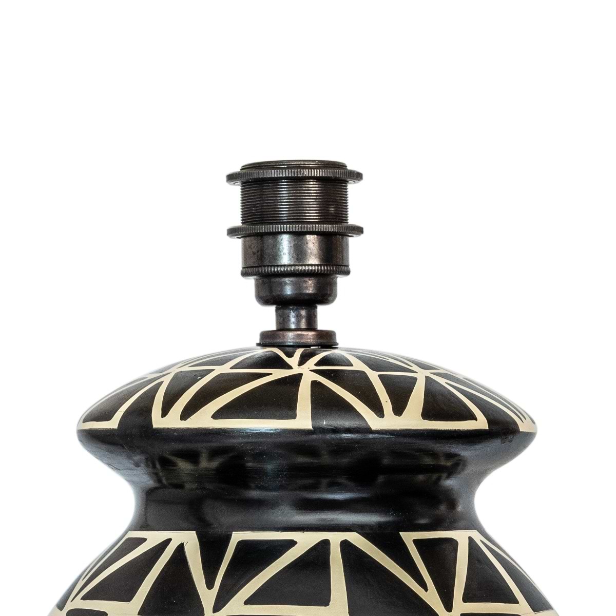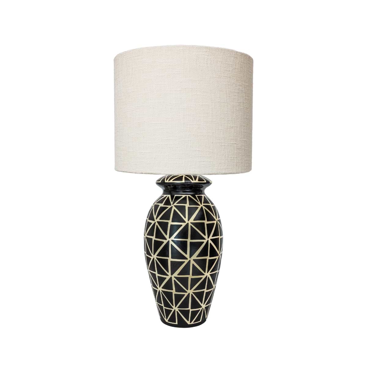 We have teamed up with renowned landscape architect Randle Siddeley to create a collection of table lamps inspired by his travels to Nicaragua. Hand-made from volcanic clay by Nicaraguan artisans, each lamp is hand-painted with idiosyncratic shapes and geometric patterns in a monochromatic palette for a true statement piece. Includes a drum shade crafted in off-white bouclé for a soft, textured finish.