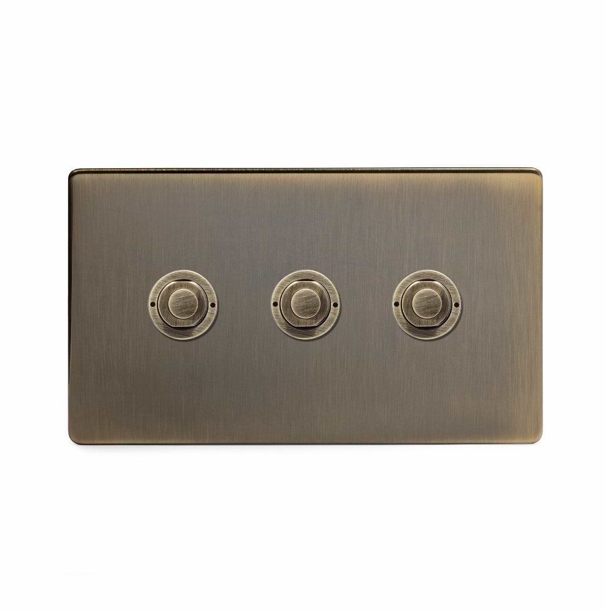 An elegant addition to our switch collection, the Push Button offers a sleek, modern design for those who love a contemporary aesthetic. The 3 gang Push Button Switch in Antique Brass operates your lighting with a simple push of a button.