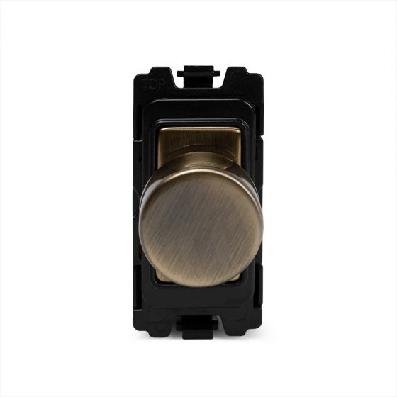 Our 6A dummy dimmer is commonly used on dimmer plates when the user does not want all of the switches to dim. By adding a dummy dimmer to a dimmer plate, all of the switches on will look the same, but instead of dimming, the dummy dimmer will just act as an on/off switch. It can also be used in conjunction with a dimming switch on a lighting circuit, but it will not dim. This Aged Brass RM Module from the Charterhouse Collection is compatible with both our RM and Dual (RM+CM) Grid Plates. With these you can create a wide range of bespoke plates such as dimmer and rocker switch combinations, to fulfil almost every imaginable lighting or isolation switch need for your home. This RM module is not compatible with CM, EM, LT1, LT2 or LT3 Plates.
