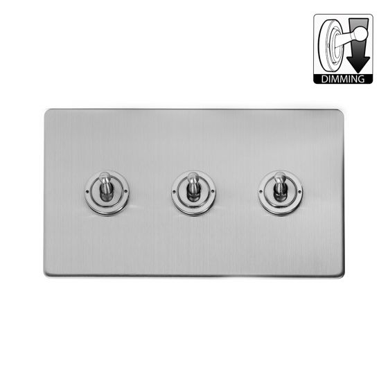 This Brushed Chrome 3 Gang Dimming Toggle Switch has a distinctive appearance and the stylish screwless finish provides a warm tone and has the added benefit of hiding fingerprints and small blemishes.Â