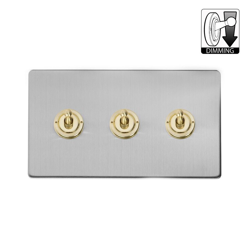 This Fusion Brushed Chrome & Brushed Brass 3 Gang Dimming Toggle Switch has a distinctive appearance and the stylish screwless finish provides a warm tone and has the added benefit of hiding fingerprints and small blemishes.