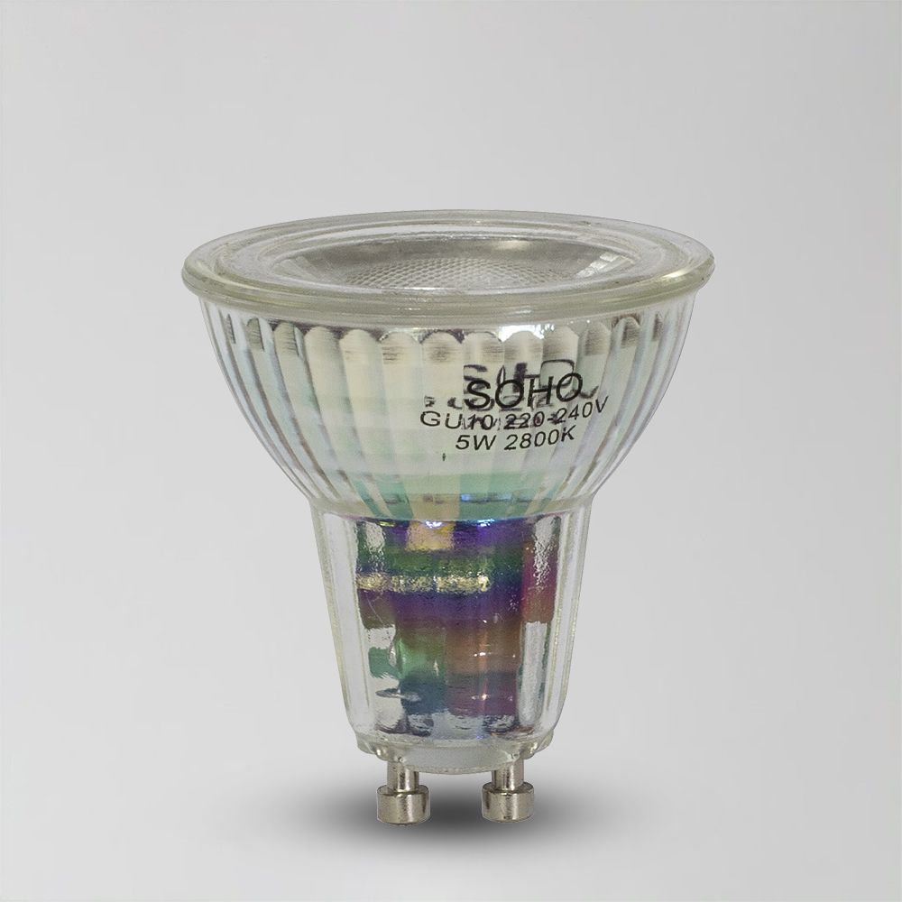 This Soho Lighting 5W 2800K warm white LED GU10 lightbulb gives off a beautiful warm white light, which is suitable for ambience and living spaces like lounges and dining rooms.