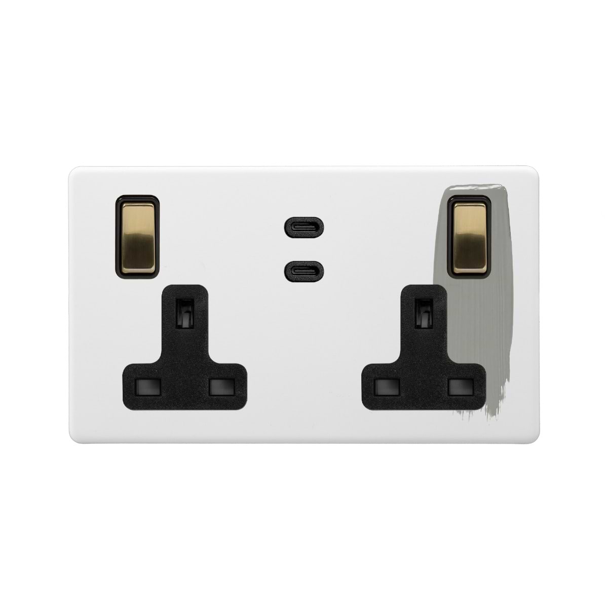 Soho Lighting Primed Paintable 2 Gang 65W USB C+C Socket (13A Socket + 2 USB C Ports) with Brushed Brass Switch with Black Insert