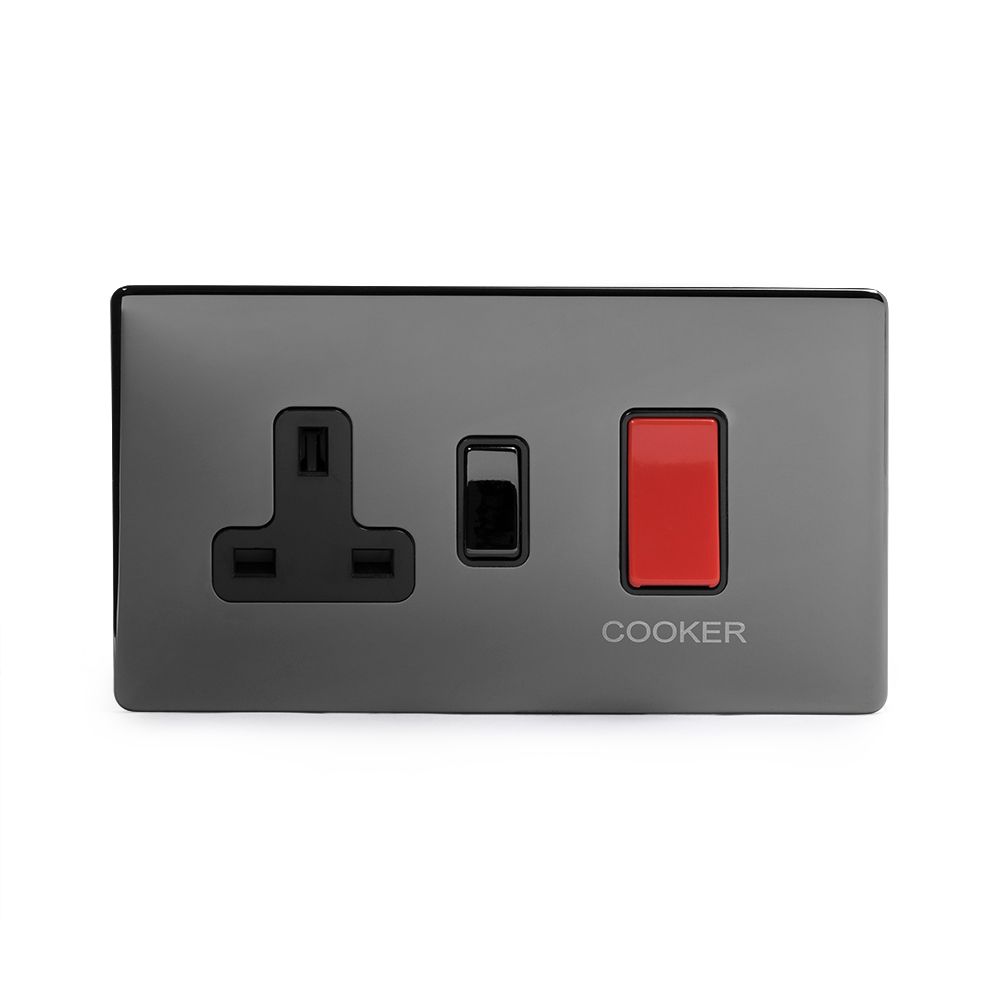 The distinctive look and stylish screwless finish of this Black Nickel 45A Cooker control provides a perfect complement to modern/contemporary kitchens with black appliances, modern bathrooms or rooms with televisions or other popular electrical equipment.