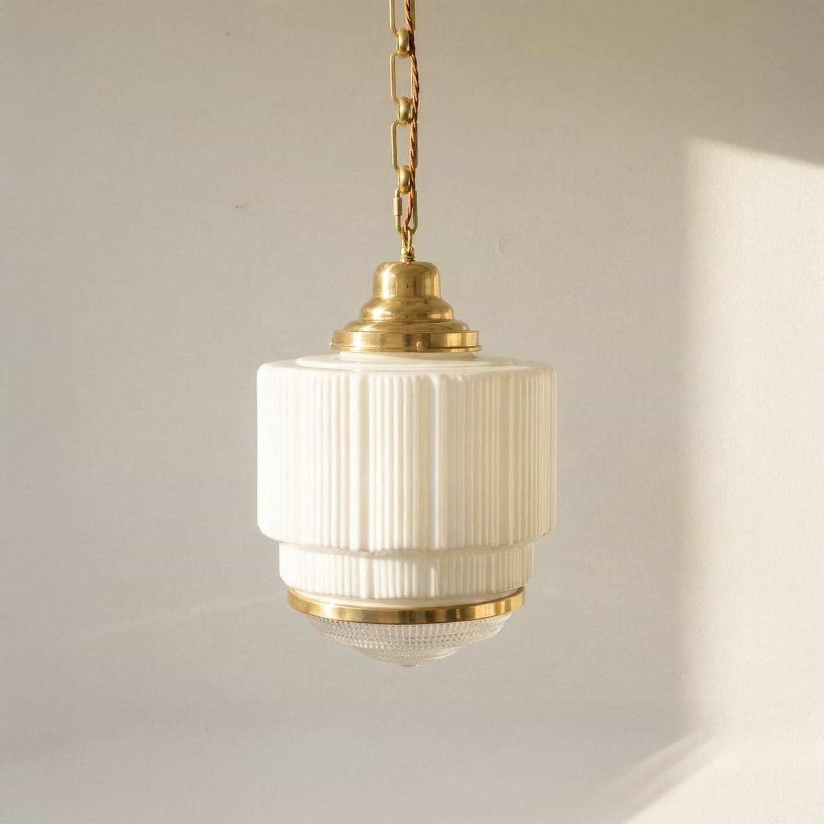 Modelled on the 1920s vintage design with neoclassical elements, the majestic Dean pendant in Polished brass has presence and adds timeless style to any interior. The , milk glass body provides a soft ambiance in contrast to the textured crystal glass base which casts out an eye-catching diffusion of sparking light which together looks stunning.
