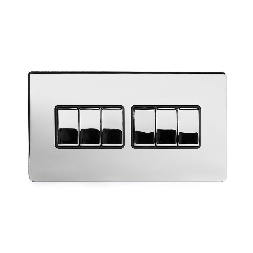 The Finsbury Collection Polished Chrome 6 Gang 2 Way 10A Light Switch Blk Ins Screwless