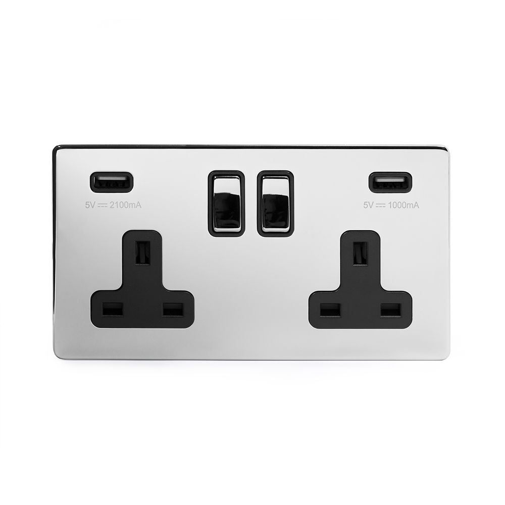 Polished Chrome is generally considered to suit modern/contemporary styles. However, this Polished Chrome Double Socket With USB with Black Insertalso complements period styles such as art deco, arts and crafts and other homes of distinction. It looks particularly striking when set against darker finishes, wood or panelling. The Finsbury collection is a popular choice for bathrooms and kitchens as it often harmonises with other polished chrome fittings, such as taps, towel rails or appliances.