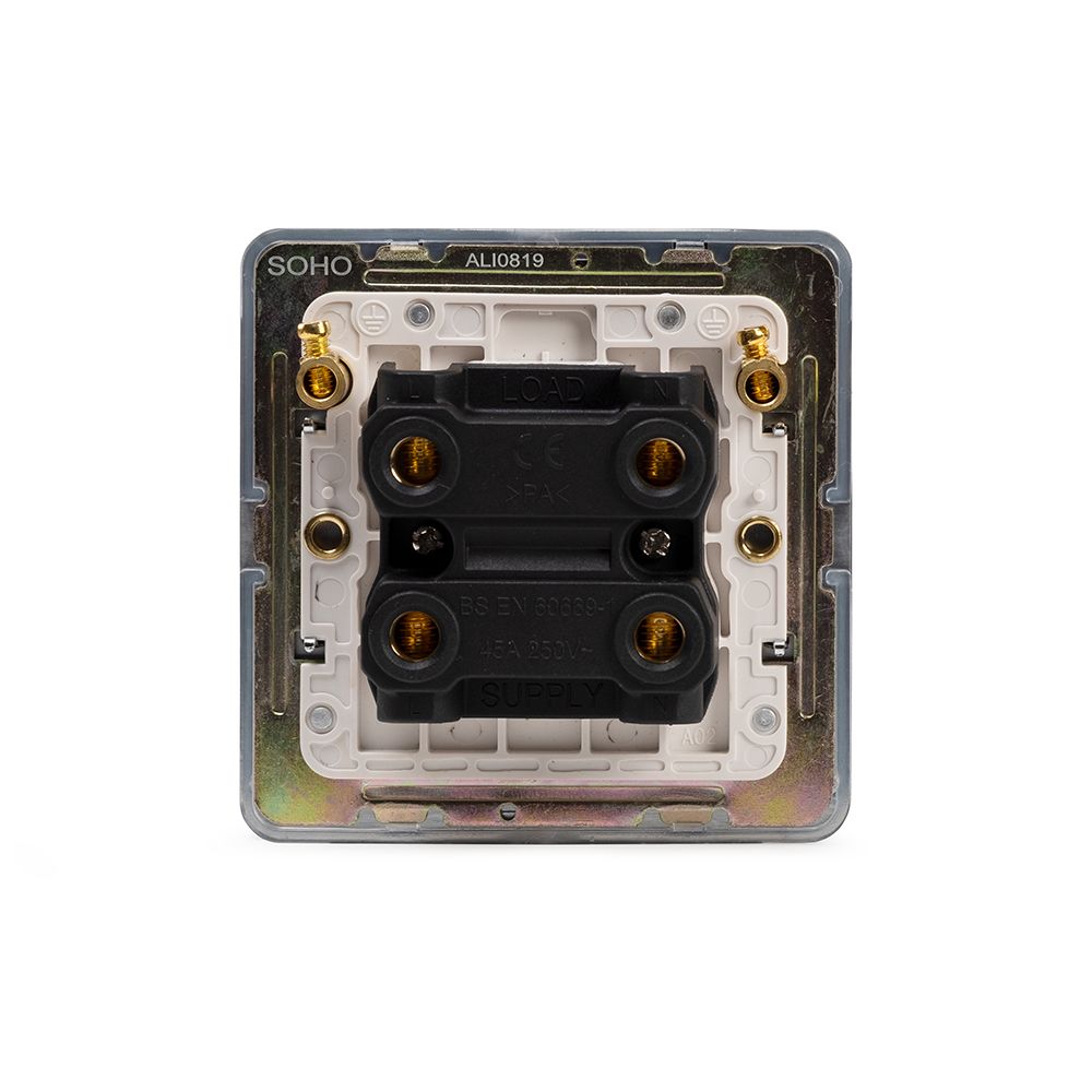 Polished Chrome is generally considered to suit modern/contemporary styles. However, this Screwless Polished Chrome Flat Plate 45A 1 Gang Double Pole Switch, Single Plate with white insert from Soho Lighting also complements period styles such as art deco, arts and crafts and other homes of distinction. It looks particularly striking when set against darker finishes, wood or panelling. The Finsbury collection is a popular choice for bathrooms and kitchens as it often harmonises with other polished chrome fittings, such as taps, towel rails or appliances.