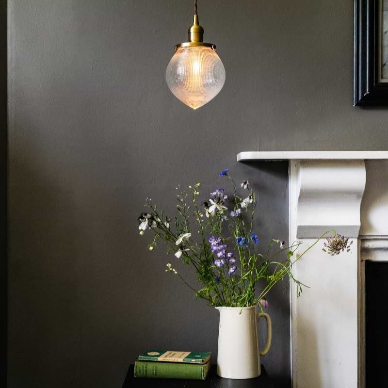 Petite and sophisticated, the Hollen Acorn industrial pendant features an Acorn shaped prismatic Holophane style glass shade topped with a solid brass cap. Originating in style from the 1930s, this pendant looks sensational when hung in multiples - either in a row or grouped at differing heights. The textured cut glass gives off a fabulous distribution of light and different coloured bulbs can be used to create different moods.