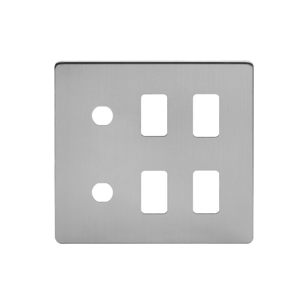 Our 6 Gang 4RM+2CM Dual Module Grid Plate from the Lombard Collection comes with a back frame/yoke and is compatible with our range of RM and CM switch modules. Our flexible and unique concept lets you create bespoke plates by mixing both rectangular rocker and circular dolly/dimmer modules to create a perfect finished plate in #brushed chrome#. Popular bespoke plates include rocker/dimmer combinations for light switches, though hundreds of unique permutations of switch and isolation plates are possible, each delivering a perfect finish for your project. This Dual (RM+CM) Grid Plate is not compatible with EM, LT1, LT2 or LT3 modules.
