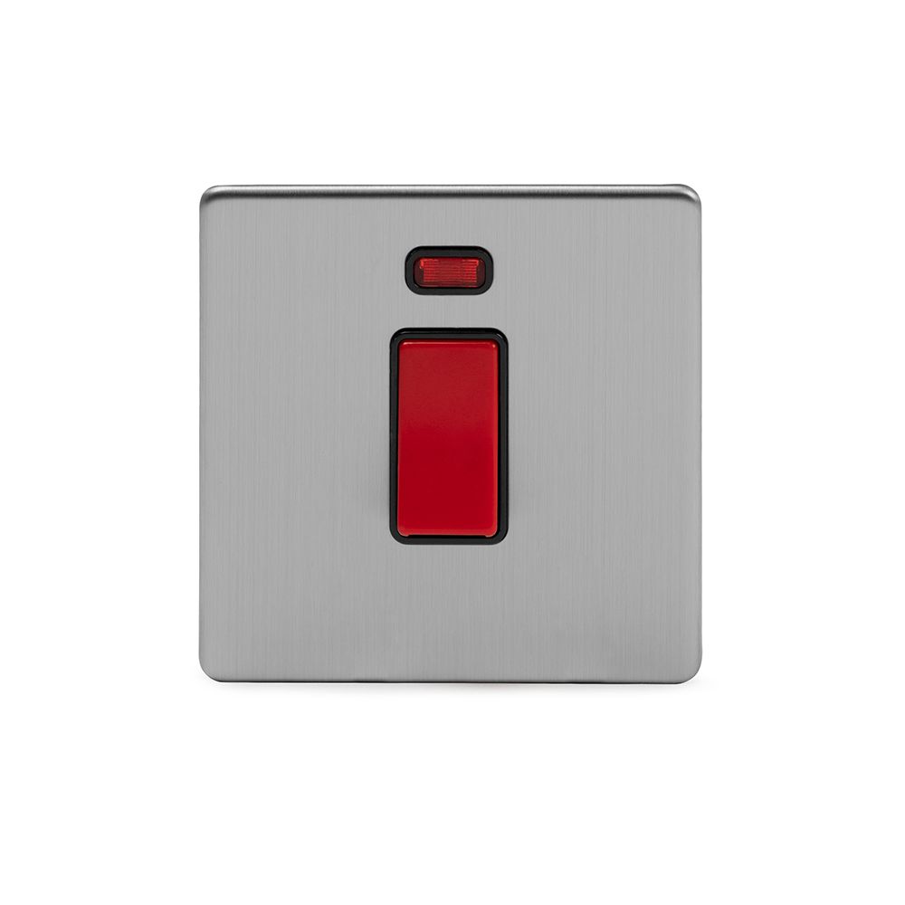 The Lombard Collection Brushed Chrome 45A 1 Gang Double Pole Switch With Neon, Single Plate Blk Ins Screwless
