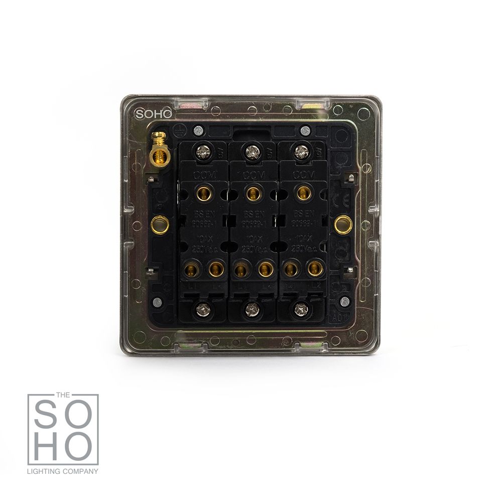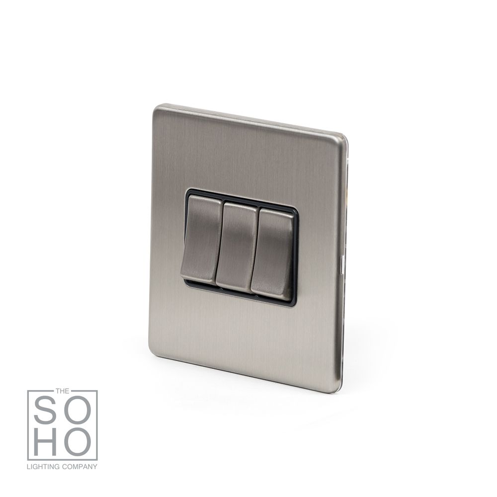 The Lombard Collection Brushed Chrome 3 Gang 2 Way 10A Light Switch Blk Ins Screwless